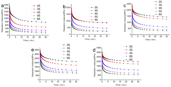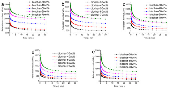 Effects of temperature on stress relaxation of different composites: (a) biochar-30 wt %; (b) biochar-40 wt %; (c) biochar-50 wt %; (d) biochar-60 wt % and (e) biochar-70 wt %.