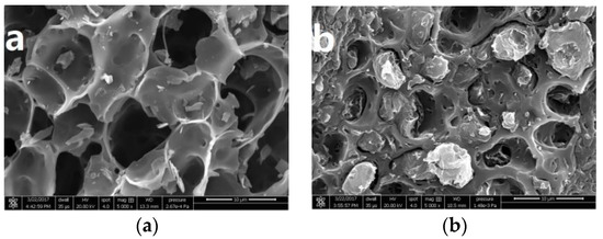 Figure 7a presents the typical morphology of the rice husk biochar used in this study at a magnification of 5000×. The rice husk biochar shows an obviously porous structure, with varied pore size and shape. The carbon skeleton, pore structure and mineral matter can be observed within the macropores of these samples, which is similar to the microstructure of carbonized wood [38,39]. The large number of holes lengthwise and crosswise in the rice husk biochar might be able to strengthen the interface with the polymer matrix, due to the ultrahigh surface area, providing the possibility of the preparation of biochar-based material. Figure 7b shows the impact fracture surfaces of rice husk biochar/HDPE composite. Of particular note is that the HDPE component was embedded into the holes of the rice husk biochar, such that it is able to combine together tightly with HDPE. This structure, which is completely different from WPC [40], could transfer the stress from HDPE to the rice husk biochar, thus improving the mechanical properties of composites [41].
