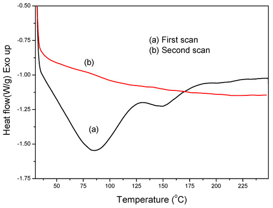 Typical differential scanning calorimetry (DSC) thermograms for dynamic scanning of sulfonated poly(ether ketone/ether benzimidazole) (SPEKEBI) with KH-560.