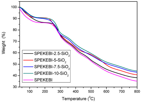 The thermal stability of SPEKEBI and SPEKEBI-x-SiO2 membranes were investigated by thermo gravimetric analysis (TGA), as shown in Figure 6. The TGA analysis revealed that with increasing content of SiO2, the weight retention of cross-linked membranes is obviously improved from 33% to 44% at 800 °C. This indicated that the incorporation of inorganic nanoparticles can improve the thermal stability at high temperature.