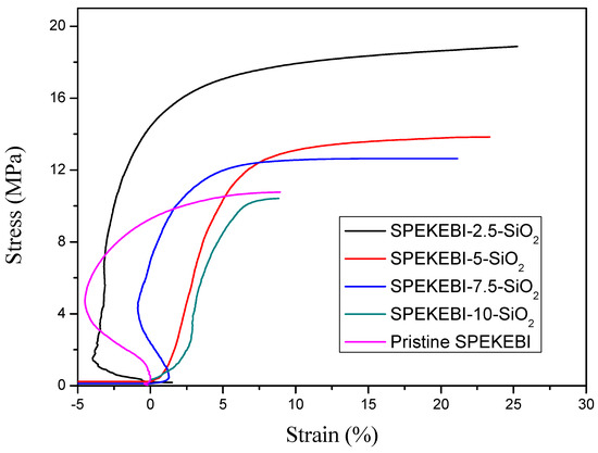 Stress vs. Strain curves of pristine SPEKEBI andSPEKEBI-x-SiO2 membranes.