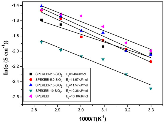 Arrhenius plot of proton conductivity for SPEKEBI-x-SiO2 and SPEKEBI membranes.