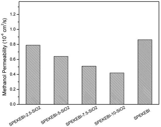 For a successful PEM, excellent methanol resistance is a necessary requirement. As reported in our prior work [31,32], the acid-base interactions can act as a barrier for methanol crossover. However, the SPEKEBI polymer has a very high sulfonation degree and the density of sulfonated hydrophilic groups is much higher than the density of basic imidazole repeat units. Besides, the acid-base interactions may affect the proton conductivity of the membranes. Therefore, the introduction of the SiO2 network is a better approach to control the methanol permeability. As shown in Figure 10, the methanol permeability decreases with increasing SiO2 content for the cross-linked membranes. All the hybrid membranes showed a better methanol blocking effect than the pristine SPEKEBI membrane. This could be attributed that SiO2 hydrophobic cross-linking networks increased the length of paths along which methanol is transported.