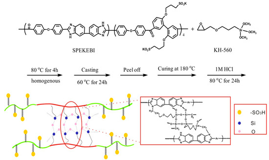 Generally, there are three ways to improve the proton conductivity: the first approach is to enhance the density of sulfonated hydrophilic groups [10]; the second way is to position the sulfonic acid groups on side chains grafted onto the polymer main chain to form Nafion-like structure with hydrophobic main backbones and pendant side chains with hydrophilic terminated sulfonic groups [11]; and the last method is to control the arrangement of the hydrophilic and hydrophobic segments to form multiblock copolymers [12]. In our prior work, a series of side-chain-type sulfonated poly(ether ketone/ether benzimidazole) (SPEKEBI) membranes have been synthesized by a 2-stage polycondensation process to form a series of multiblock copolymers. These polymers address both the segmented architecture and side-chain-type sulfonic acid groups. What is more, densely sulfonated polymer can be easily synthesized by raising the feed ratio of sulfonated monomer and tetramine monomer to 4:1, which is marked as SPEKEBI-4 [13]. However, despite the high proton conductivity, several problems remain still open when the sulfonation degree is too high, especially when taking into account the methanol permeability and mechanical stability. Hence, further modification of SPBIs is still desired to truly unlock their potential for fuel cell applications. The cross-linking and organic-inorganic hybridization methods are efficient for overcoming the trade-off effect by creating spatial features at the submicron- or nano-scale range [14]. Shahi et al. [15] reported the synthesis of crosslinked sulfonated poly(ether sulfone) (SPES) membranes using disulfonated 4,4′-bis(4-aminophenoxy)biphenyl-3,3′-disulfonic acid (BAPBDS) as crosslinking agent to circumvent the dilution of sulfonic groups by the added linkers. Xu et al. [16] prepared a series of covalently cross-linked sulfonated poly(imide-benzimidazole) membranes using 4,4′-bibromomethenyl diphenyl ether as a cross linker which showed enhanced mechanical properties and chemical stabilities. On the other hand, the introduction of inorganic nanoparticles into the polymer matrix is also a promising technique to improve the thermal stability and water retention capacity, as well as selective barrier properties. A variety of inorganic fillers such as silica [17,18,19,20], silver nanoparticles [21], grapheme oxide (GO) [22], protonated montmorillonite (MMT-H) [23] and metal-organic frameworks (MOFs) [24] have been explored. Na et al. [17] has employed both the cross-linking method and the in situ sol-gel method to improve the thermal and mechanical stability as well as phosphoric acid loading contents of PBI membrane. In the present work, we employed similar methods and prepared a series of densely sulfonated poly(ether ketone/ether benzimidazole) (SPEKEBI)-SiO2 composite membranes using γ-(2,3-epoxypropoxy) propyltrimethoxysilane (KH-560) as a crosslinker with contents of 0 (pure SPBEKEI-4), 2.5, 5, 7.5, 10 wt % in the resulting membrane, respectively. The cross-linker was introduced through a facile and general heating method by forming an amide-type linkage between epoxy silane and imidazole groups. Afterwards, hybrid membranes with silane-cross-linked network structure were achieved by in situ sol-gel process in hydrochloric acid solution. Several properties including their solubility, swelling degree, oxidative and mechanical stabilities, methanol permeability and proton conductivity, were studied in detail. Meanwhile, the influence of the SiO2 doping level in the membrane was discussed.
