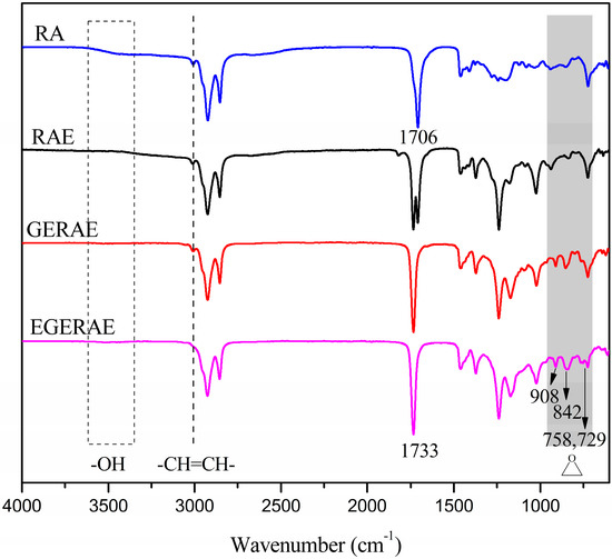 Figure 2 shows the FT-IR spectra of RA, RAE, GERAE and EGERAE. In the spectrum of RA, the broad absorption at around 3550–3250 cm−1 was due to the presence of C–H and O–H stretching vibrations. The peak at 1706 cm–1 was attributed to the carboxylic acid group. Compared to the FT-IR spectrum of RA, it can be seen that the absorption peaks of –OH group disappeared in the RAE spectrum. In the EGERAE spectrum, the absorption at around 1733 cm–1 corresponded to the carboxylic eater groups; furthermore, characteristic features of the glycidyl esters group were found at 910, 853 and 726 cm–1. In the spectrum of EGERAE, the absorption at around 3009 cm–1 attributed to the –CH=CH– disappeared. In addition, the epoxy groups peaks were observed at 908, 842, 958 and 729 cm–1. These characteristic peaks suggested that EGERAE had been obtained.