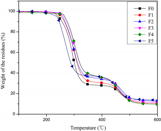 Thermogravimetric analysis (TGA) was carried out in a 409PC thermogravimetric analyzer (Netzsch Co., Bavaria, Germany). Each specimen was scanned from ambient temperature to 600 °C under a nitrogen atmosphere at a heating rate of 10 °C/min.
