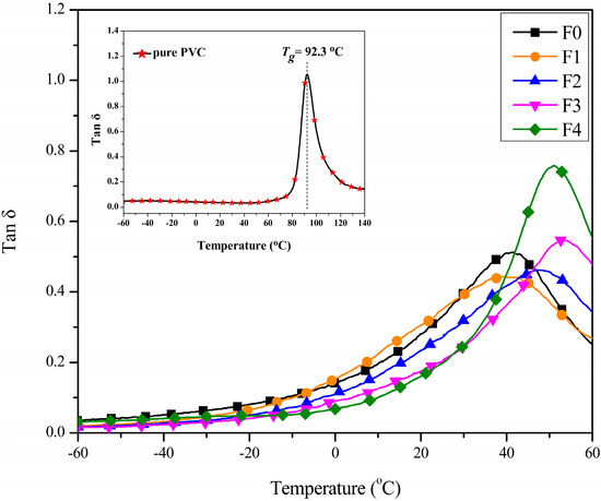 The dynamic mechanical properties of the PVC films were investigated using DMA technology. Figure 6 shows the loss factor (tan δ) curves of the PVC films with different plasticizers. Only one peak could be seen in each curve, suggesting that the blend was a homogenous material, and that the plasticizer had good compatibility with PVC [3,31]. Glass transition temperature (Tg) was determined as the temperature at the maximum of the tan δ curve, and is presented in Table 2. The Tg value of films F0-F4 were 41.5, 39.2, 46.9, 53.1 and 51.0 °C, respectively, which were far below the value of 92.3 °C for pure PVC. It can be seen that the Tg of film F1 (with 10 phr EGERAE) is lower than that of film F0. This can be explained by the fact that the long alkyl chain and epoxy polar groups of EGERAE lubricated and interacted with the polar fraction of the PVC molecule, decreasing the crosslinking of PVC-PVC, increasing the free volume of the polymer’s amorphous region (as shown in Figure 7), and resulting in a decrease in Tg. With the increase of EGERAE content, tan δ value peaks shifted towards higher temperatures, and the corresponding Tg increased [32]. This might have been caused by the chemical structure of EGERAE [33,34]. Due to the higher molecular weight of EGERAE (412.5) compared with DOP (391), the plasticizing effect of the plasticizer on PVC would be correspondingly reduced when DOP was replaced with more than 10 phr EGERAE. However, the addition of EGERAE increased the damping capability, which led to taller and narrower tan δ peaks than those of film F0.