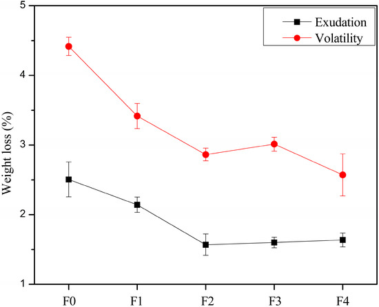 The weight losses of the PVC films after exudation and volatility tests are shown in Figure 8. It can be seen that the exudation resistances of films F1–F4 were similar to film F0. On the other hand, the weight loss after volatility testing generally followed the order F0 > F1 > F2 > F3 > F4, indicating the volatilization loss generally decreased with an increase in EGERAE content.
