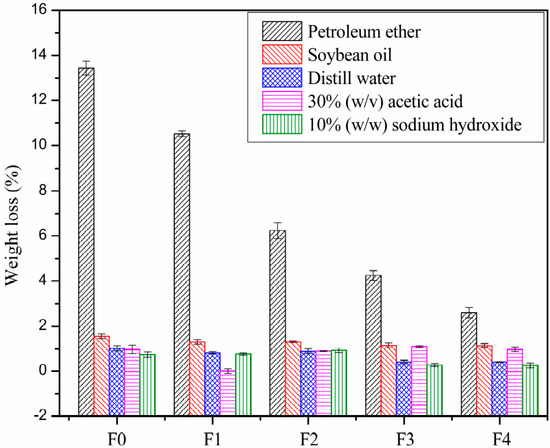 The weight losses of the PVC films by exudation in petroleum ether, soybean oil, distill water, 30% (w/w) acetic acid and 10% (w/w) NaOH are shown in Figure 9. The PVC films showed different migration resistances during extraction testing. When leached in petroleum ether, all of the plasticizers showed poorer migration resistance than in the other solvents. It could be clearly observed that the migration resistance in petroleum ether was improved with the substitution of EGERAE into DOP. Furthermore, all of the films showed poorer extraction resistance in soybean oil than in distilled water, acid and alkali. This is mainly due to the plasticizers being organic solvents. In addition, with the substitution of EGERAE into DOP, the resistance of extraction by 30% (w/w) acetic acid and 10% (w/w) NaOH was similar to that of the film using pure DOP.