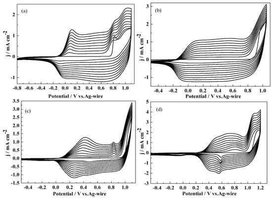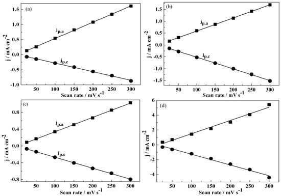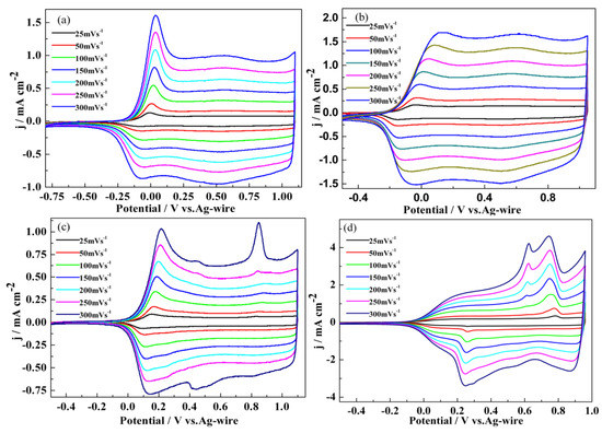 Figure 3 presented the relationships between the peak currents and the scanning speed, which rendered the direct evidence for confirmation of the reversibility of the doping/dedoping process of the polymers. Obviously, the perfect linear relationship was present between two parameters of current densities and scan rates, which indicated that the presence of the reversibility of the doping/dedoping process and the good conductivity of four polymers. The linear relationships between the scan rates and the peak current densities of the polymers also indicated that the conductive polymers prepared by electrochemical deposition are tightly bonded to the electrodes, and the charge transfer between the polymer films and the electrode are smooth [].