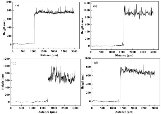 The step profiler images of P1 (a), P2 (b), P3 (c), and P4 (d) films deposited potentiostatically onto ITO electrodes.