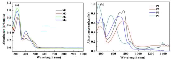 The spectroelectrochemistry of the four polymer films was carried out to get detailed information about the changes in the conjugation structures of the polymers during the doping process, which is shown in Figure 8. A total charge of 2.5 × 10−2 C was deposited on the ITO electrode with an area of 0.8 × 1.8 cm, with the polymerization potential of 1.1 V for P1, 1.05 V for P2, 1.1 V for P3, and 1.2 V for P4. The polymers were switched to their neutral states before the beginning of the experiments. The changes in absorption profile were recorded in the electrolyte when the biased potential was switched from the negative potential to the positive potential in a gradually increased mode. The color change from the neutral to the oxidized states for each polymer is also presented in the inset of Figure 8.