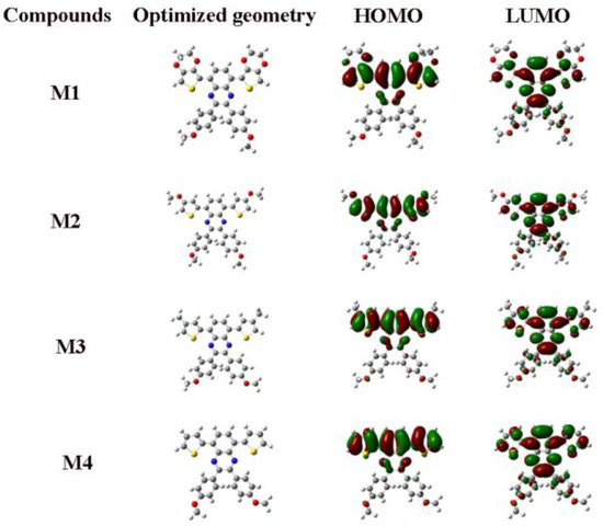 For all of this, the relative order of the theoretical optical band gaps is consistent with that of the experimental values. Density functional theory was used to further research on the structures of the monomers, including the band gap, planar structure and HOMO–LUMO levels (Table 1 and Figure 7). As shown in Figure 7, the HOMO and LUMO orbital energies of the monomers were largely delocalized on the aromatic rings, which implied that a planar conjugated system was obtained. According to the difference in the distribution of the electron clouds in the HOMO and LUMO orbital energies, the phenomenon of charge transfer could be easily identified in the four D–A–D type monomers.