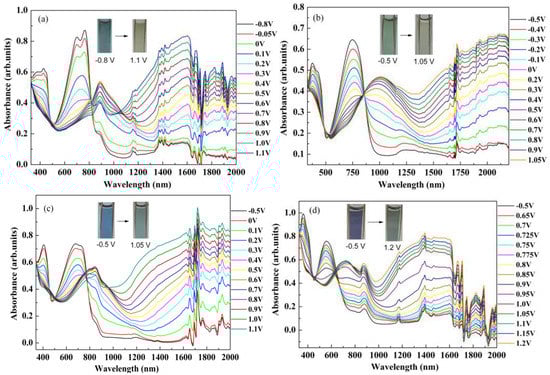 The variance in the optical absorption spectra of the polymer films on ITO electrodes in the monomer-free electrolyte when the biased potential was adjusted between −0.8 V and 1.1 V for P1 (a); −0.5 V and 1.05 V for P2 (b); −0.5 V and 1.1 V for P3 (c); and −0.5 V and 1.2 V for P4 (d).