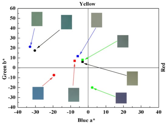 Colorimetry a*b* color coordinates of all the polymers in the different states. Circles refer to the reduced state, and squares refer to the oxidized state.