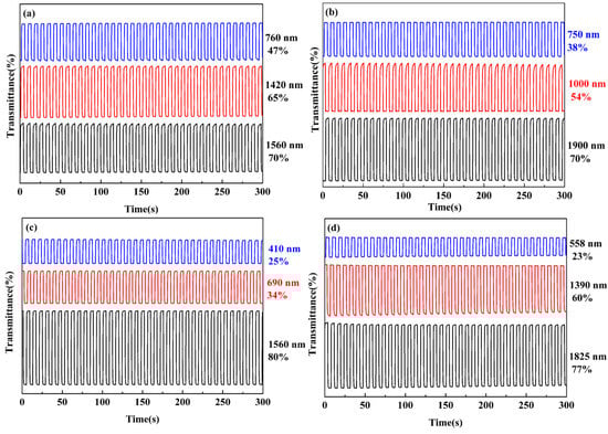 Transmittance changes of the four polymers by continuous monitoring at the indicated wavelength during the electrochromic switching in the electrolyte. (a) P1, −0.8 to 1.1 V; (b) P2, −0.5 to 1.15 V; (c) P3, −0.5 to 1.1 V; (d) P4, −0.5 to 1.2 V.