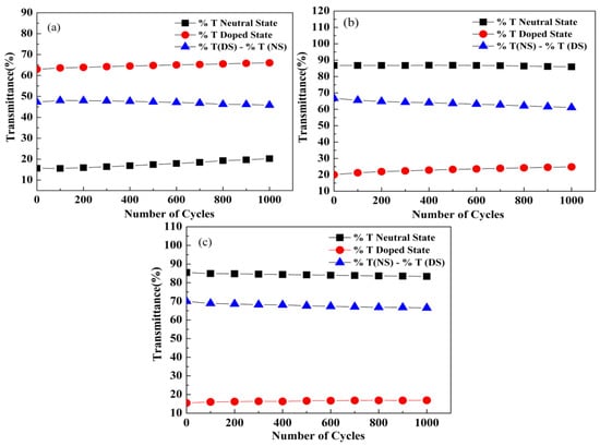 As presented in Figure 10c, P3 showed a ΔT% value of 25% at 410 nm, and the data were 34% and 80% at 690 nm and 1560 nm, respectively. Stability tests showed that the loss in ΔT% values for P3 were 1.3% (from 25.4% to 1.3%) at 410 nm, 0.9% (from 34.0% to 33.1%) at 690 nm, and 0.5% (from 79.8% to 79.3%) at 1560 nm (Figure S8a–c). The optical contrasts for P4 were found to be 23% at 558 nm, 60% at 1390 nm, and 77% at 1825 nm (Figure 10d). Similarly, the loss in ΔT% value for P4 was 0.6% (from 23.6% to 23.0%) at 558 nm, 0.8% (from 60.6% to 59.8%) at 1390 nm, and 0.4% (from 77.1% to 76.7%) at 1825 nm (Figure S9a–c). Obviously, there was only a small loss for all of the polymers up to 1000 repeated switches, which demonstrated that the four polymers presented robust kinetic stabilities. All of the polymers reported in this study revealed relatively high optical contrasts in contrast with the similar structures of the D–A type polymers reported previously, such as poly(2,3-di(5-methylfuran-2-yl)-5,8-bis(2-thienyl)quinoxaline) (PMFTQ) and poly(2,3-di(5-methylfuran-2-yl)-5,8-bis(2-(3,4-ethylenedioxythiophene))quinoxaline) (PMFEQ) []. In addition, all four polymers had relatively high optical contrast values in the NIR region, which endowed the polymers with the indispensable merit for their utilization as the active materials for the NIR electrochromic device.