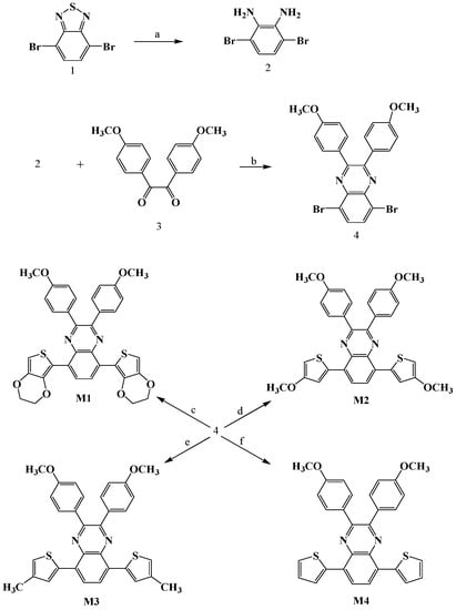The synthetic route of the monomers and reaction mixtures, including: compound 4, Pd(PPh3)2Cl2 (2% molar ratio of the organotin compounds), dry toluene, the organotin compounds of 3,4-ethylenedioxythiophene (EDOT) (M1), 3-methoxythiophene (MOTh) (M2), 3-methylthiophene (MTh) (M3), and thiophene (Th) (M4), refluxed under argon atmosphere for 24 h.