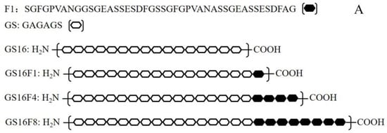 In our previous work, repetitive GAGAGX polypeptides (X is A, Y, V, or S) derived from the H-Chain were designed and produced using chemical synthesis []. These four polypeptides aggregate into different molecular conformations by self-assembly. We also biosynthesized all four (GAGAGX)16 repetitive polypeptides via genetic engineering and explored their molecular conformations [,], and a similar study on non-repetitive regions of Fn (n = 1, 2, 3, 4, 8, and 12) has recently been completed [,]. The major aim of the present work was to produce recombinant proteins composed of the (GAGAGS)16 repetitive fragment and the non-repetitive F1, F4, and F8 fragments in a prokaryotic system and investigate the characteristics of the expression products.