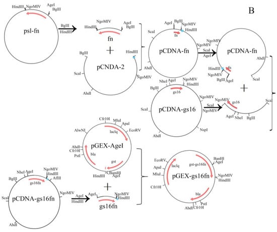 Recombinant genes were cloned as previously described []. Gene fragment and all multimers were digested from pSL-fn with BglII and HindIII, then inserted into pCDNA-2 pre-digested with the same enzymes to obtain pCDNA-fn. Plasmid pCDNA-gs16 was digested with ScaI and NgoMIV, and the resultant gs16 fragment was inserted into pCDNA-fn pre-digested with AgeI and ScaI to obtain pCDNA-gs16fn. Recombinant gs16fn genes were excised from pCDNA-gs16fn using AgeI and HindIII and inserted into the expression vector pGEX-AgeI to generate GST gene fusions (Figure 1B). An AgeI site was inserted in pGEX-KG to obtain plasmid pGEX-AgeI []. The resulting expression vectors were designated pGEX-gs16f1, pGEX-gs16f2, pGEX-gs16f3, pGEX-gs16f4, pGEX-gs16f8, and pGEX-gs16f12. All vectors were further verified by nucleotide sequencing (Invitrogen, Carlsbad, CA, USA).