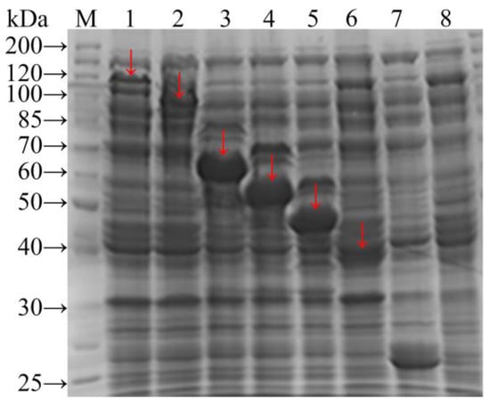 As described previously for the expression of repetitive and non-repetitive fragments [,], recombinant genes were expressed under the regulation of the Ptac promoter, which includes a translation-enhancing sequence (g10), and a ribosome-binding site for transcriptional control. The fused GST tag was applied to purify the expression products, and was cleaved by thrombin. The ATG initiation codon was upstream of the GST gene, and the TGA termination codon followed the gs16fn target gene. Expression of gs16fn (n = 1, 2, 3, 4, 8, and 12) was first evaluated in crude cell extracts by SDS-PAGE. Fusion proteins GST-GS16F12, GST-GS16F8, GST-GS16F4, GST-GS16F3, GST-GS16F2, and GST-GS16F1 all showed clear bands (Figure 3, lanes 1–6, respectively, indicated by red labels).