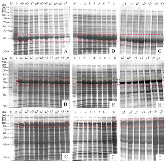 SDS-PAGE electrophoretogram of E. coli BL21 total proteins under different expression conditions. (A–C) different IPTG concentration (mM); (E,F) different induce time (h); (G–I): different initial cell density (OD600). (A,D,G): GST-GS16F1; (B,E,H): GST-GS16F4; and (C,F,I): GST-GS16F8.