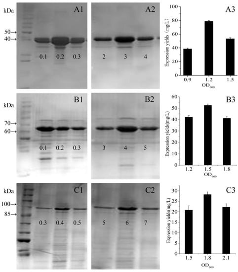 Expression level of each fusion protein by the three points method. (A1–A3) GST-GS16F1; (B1–B3) GST-GS16F4; and (C1–C3) GST-GS16F8. A1–C1: different IPTG concentration (mM); A2–C2: different induce time (h); and A3–C3: different initial cell density.