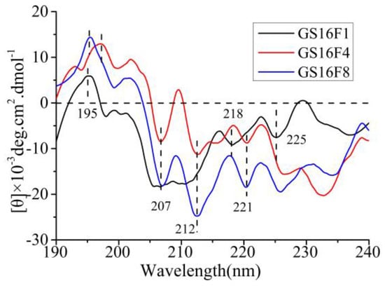 Per milligram purified fusion protein was digested using 1 U thrombin (Novagen) in lysate buffer at 20 °C for 16 h, as previously described []. The diluted reaction mixture was loaded onto a GST-affinity column to remove the GST-tag and collect the polypeptides GS16F1, GS16F4, and GS16F8. Then the polypeptides were detected via a J-815 CD spectrometer (Jasco, Tokyo, Japan), using a 1.0 mm path-length cell at 25 °C with an accumulation time of 4 s and a scanning rate of 100 nm·min−1.