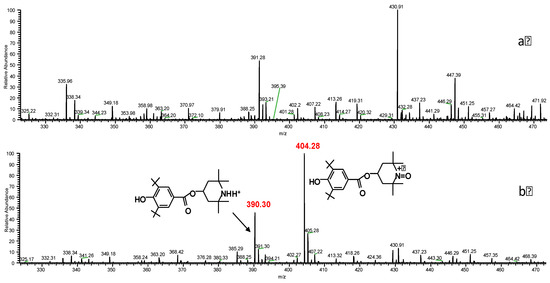 Before irradiation, the ESI mass spectrum of the products extracted from EOC-g-(BHB-T)_2 (Figure 2a) shows peaks that can be assigned to some impurities present in the solvent/background signal and/or to some additives of the polymer, but no signals attributable to BHB-T or its derivatives were detected. After 6 days of photo-exposure, the signal at m/z 404.28, belonging to BHB-T, and a peak at m/z 390.30 reasonably assigned to the parent amine of BHB-T, appeared [32,46,47] (Figure 2b). Similar results were obtained in the case of EOC-g-(Bz-T): the ESI mass spectra of this sample before and after photo-exposure are reported in the Supplementary Material (Figure S6). The presence of these species all over the irradiation period (20 days) pointed out a prolonged action of both grafted TEMPO moieties that is likely due to the presence of a covalent bond between TEMPO functionality and polymer matrix.