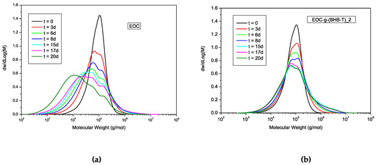 In the case of EOC (Figure 3a), the photo-oxidation caused a large modification of the pristine molecular structure of the polymer as evidenced by the presence of long tails at high molecular weights, especially for low irradiation time, and by a general shift of the curves towards low molecular weights. In the case of EOC-g-(BHB-T)_2 (Figure 3b), although a large and partially multimodal molecular weight distribution was observed, especially for long irradiation time, a greater control of the molecular structure was obtained. In particular, both the Mn and the apparent viscosity, related to the hydrodynamic radius of macromolecules, (Figures S8 and S9 and Table S1 in Supplementary Material) were subjected to a very limited variation during the irradiation process.