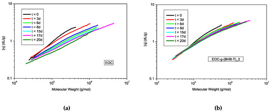 Mark-Houwink-Sakurada (MHS) plot before and during photo-oxidation of EOC (a) and EOC-g-(BHB-T)_2 (b).