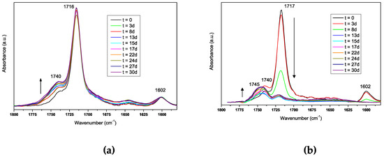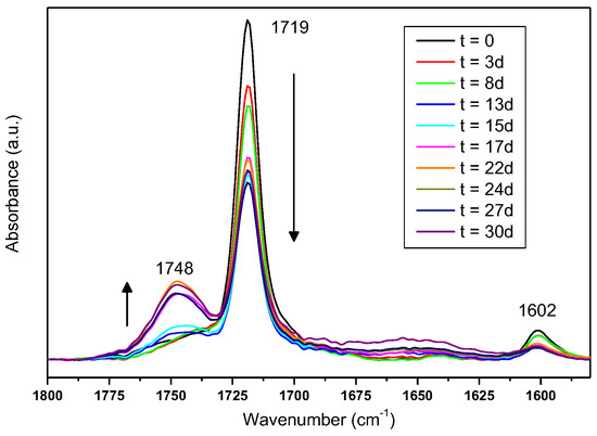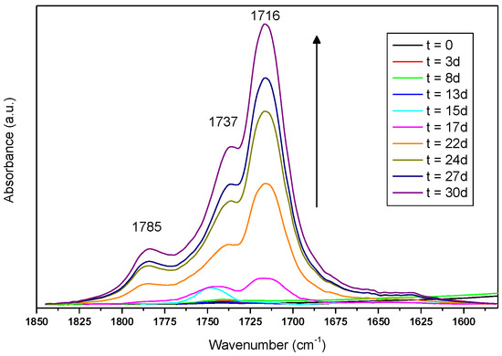 Accelerated oxidation was carried out at 110 °C in an oven and was followed by FT-IR spectroscopy by periodically recording the spectra of the polymer samples. The temperature chosen for the experiment is over that of EOC melting (50–60 °C) [39] to speed up the process. Superimposition of the FT-IR spectra clearly evidenced that the thermal oxidation of the pristine polymer matrix (Figure 5) gives rise to the formation of different oxidation products. In agreement with the literature [50], the observed bands can be attributed to the formation of conjugated ketone (1700 cm−1), carboxylic acid (1712 cm−1), ketone (1721 cm−1), ester (1737 cm−1), peroxy acid or ester (1755 cm−1), and lactone (1783 cm−1) groups (as compared with Figure S10 that reports the deconvolution of the spectrum recorded after 30 days of thermal oxidation).