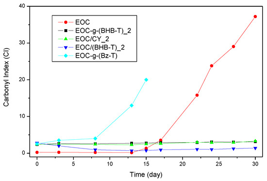 Similarly, in the case of EOC/CY_2, where CY is free, the carbonyl signal as well as the band at 1602 cm−1 both attributable to the presence of CY, decreased during oxidation and a new signal at about 1748 cm−1 increased (Figure 8). These results suggest that although free AO molecules can preserve the polymer from oxidation, their mobility can cause the migration and the partial loss of the functional molecules as evidenced by the decrease of their characteristic signals. This occurs especially in the case of BHB-T that has a lower molecular weight than CY and probably also a limited affinity for the polymer matrix.
