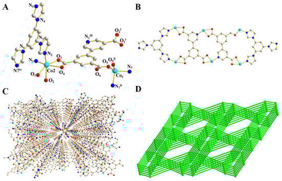 (A) The coordination environment of two Co(II) ions; (B) coplanar structure with two 21-membered-rings and one 18-membered-ring; and (C,D) the 3D structure and simplified 4-connected Wei topology of 1.