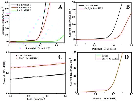 (A) Polarization curves of 1 in 0.1 M, 1 M and 2 M KOH; (B) polarization curve of 1 and benchmark Co3O4 in 1 M KOH; (C) polarization curve derived Tafel plots of 1 and benchmark Co3O4 in 1 M KOH; and (D) polarization curves for the 1st and 100th potential cycles of 1 in 1 M KOH.