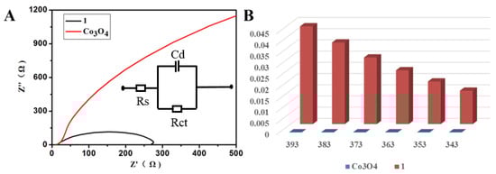 (A) Nyquist plots of 1 and benchmark Co3O4 examined at 0.5 V (vs. Saturated calomel electrode SCE); and (B) TOFs of 1 and benchmark Co3O4 at different overpotentials from 343 to 393 mV.