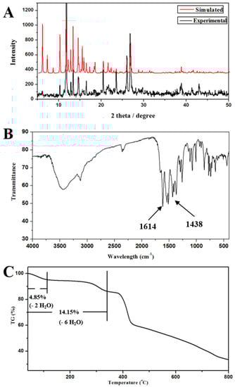 FT-IR spectrum of 1 was also investigated (Figure 4B). As indicated by the IR spectroscopy result of 1, the sharp bands observed at about 1614 and 1438 cm−1 can be ascribed to symmetric and asymmetric stretching vibrations of carboxylic group, respectively [58,59].