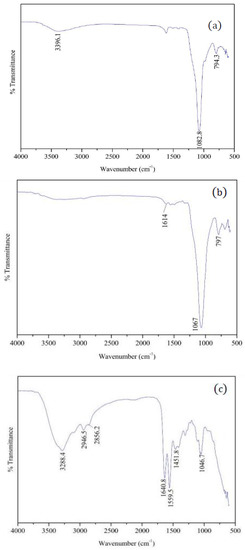 The ATR-IR spectra of hydroxylated silica, silanized silica and CSP particles are shown in Figure 1. The weak peak at 794 cm−1 and sharp peak at 1083 cm−1 in the ATR-IR spectrum of hydroxylated silica can be assigned to Si–O and Si–O–Si stretching vibration, respectively. The broad absorption at 3396 cm−1 is attributed to hydroxyl group (–OH) stretching. The spectrum of silanized silica particles is similar to that of hydroxylated silica, but two differences can still be observed. On the one hand, the weak peak appeared at 1614 cm−1 can be ascribed to N–H stretching. On the other hand, peak at 3396 cm−1 disappeared. These two differences may indicate that the hydroxylated silica particles are successful silanized by γ-APS. In the spectrum of CSPs, the broad peak at 3288.4 cm−1 is assigned to the N–H stretching vibration of the primary amine. The peaks at 2856.2 and 2946.5 cm−1 can be attributed to the symmetry and asymmetry stretching vibration of C–H, respectively. The peak at 1640.8 cm−1 is assigned to –CONH– stretching vibration. The peak at 1559.5 cm−1 is attributed to N–H bending vibration. The peak at 1451.8 and 1046.7 cm−1 can be assigned to C–N bending and stretching vibration, respectively. These results indicated that CSPs have been successfully fabricated through grafting ATHBP to the surface of silanized silica particles.