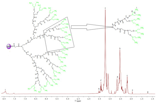 The 1H NMR spectrum of CSPs provides more detailed evidence to prove the successful growth of ATHBP in the surface of silanized silica particles (Figure 2). The 1H NMR spectrum clearly displays the characteristic peaks of ATHBP. The peaks at 1.779 (protons a), 2.533 (protons b), 2.188 (protons c) and 2.665 (protons d) ppm are assigned to the linear units. The peaks at 3.222 (protons e) and 3.414 (protons f) ppm are ascribed to the dendritic units. The peaks at 1.554 (protons g), 3.503 (protons h) and 7.82 (protons i) ppm are attributed to the terminal units.