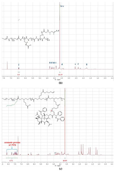 All compounds and polymers obtained at each step were characterized by 1H NMR. A Bruker AVANCE III HD instrument equipped with a 600 MHz magnetic field was employed to record 1H NMR spectra. The proton signals of all the products were measured in CDCl3 solution. The of conjugates and PTX loading contents in the prodrug were determined by the characteristic peaks of PEG, PCL and PTX.