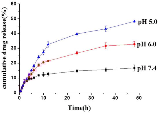 Because PTX was covalently conjugated to the mPEG-VPCL di-block copolymers through a pH-sensitive acetal linkage, the mPEG-PCL-Ace-PTX5 micelles are expected to be pH-responsive. The in vitro drug release from the mPEG-PCL-Ace-PTX5 micelles was investigated at 37 °C under three different pH levels, i.e., pH 5.0, 6.0, and 7.4. As shown in Figure 3, the cumulative release of PTX was 16.8%, 32.8%, and 48.2% in 48 h at pH 7.4, 6.0, and 5.0, respectively, which demonstrated that PTX release was remarkably accelerated under moderate acid environments. It should be noted that the drug release ratio of mPEG-PCL-Ace-PTX5 micelles is relatively lower than that of PEG-PAA-acetal-PTX [] and PEG-acetal-PTX with free PTX encapsulated in 48 h at pH 7.4 []. However, a comparatively higher PTX release was observed for mPEG-PCL-Ace-PTX5 micelles compared with PTX-acetal-pDMA in 48 h under a mildly acidic environment. Moreover, as expected, no burst release was observed under both normal physiological and acidic conditions due to the covalent linkage between PTX and mPEG-VPCL. These results demonstrate that mPEG-PCL-Ace-PTX5 micelles possess the characteristics of better stability and lower undesired drug leakage in process of drug delievery.