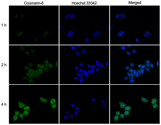 Confocal laser scanning microscopy images of MCF-7 cells incubated with micelles encapsulating coumarin-6 for 1, 2, and 4 h.