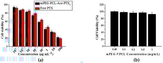 MTT assays of PTX mPEG-PCL-Ace-PTX5 micelles (a) and Vinyl Ether-Functionalized mPEG-PCL (b) against MCF-7 cells. Data are presented as the average ± standard deviation (n = 3).