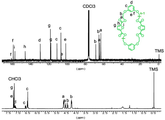1H and 13C NMR spectra were recorded on a Bruker AMX-300 spectrometer (Bruker, Billerica, MA, USA) at 25 °C, operating at 300.1 and 75.5 MHz, respectively. For NMR analysis, monomers, cyclic oligomers, intermediate compounds, and polymers were dissolved in deuterated chloroform (CDCl3), and spectra were internally referenced to tetramethylsilane (TMS). About 10 and 50 mg of sample in 1 mL of solvent were used for 1H and 13C NMR, respectively. Sixty-four scans were recorded for 1H and between 1000 and 10,000 scans for 13C NMR.