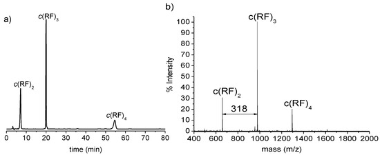The composition of the c(RF)n fraction was determined by HPLC chromatography and MALDI-TOF spectroscopy, and results obtained therefrom are shown in Figure 2. Three peaks were observed in the HPLC chromatograms which correspond to dimer, trimer and tetramer species in an approximate molar ratio of 2/4/1, as it was ascertained in the MALDI-TOF spectra. According to these results, the content of this fraction in species of size higher than tetramer may be considered almost negligible.