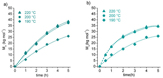 The synthesis of the copolyesters was performed by ED-ROP (Entropically-Driven Ring Opening Polymerization) in bulk using Sn(Oct)2 as catalyst. Two copolyesters series, i.e., coPBSxRFy and coPESxRFy, were prepared frommixtures of either c(BS)n or c(ES)n and c(RF)n at molar ratios ranging between 10% and 90%, in addition to the homopolyesters PBS, PES and PRF. Reaction temperatures above 190 °C were used to insure melting of the cycles. Preliminary assays indicated that reaction noticeably speeded when temperature was raised from 190 to 200 °C but not significant change in rate was observed when temperature was further increased, a behavior that was shared by the two series (Figure 4). According to these results, this was the temperature of choice applied for the synthesis of the whole collection of copolyesters. The evolution of the molecular weight of the forming polymer as a function of reaction time for several selected compositions is represented for the two series in Figure 5. An asymptotic trend was followed in all cases showing a notable decay in reaction rate after five hours when weight-average molecular weight values up to ~40,000 and ~50,000 g·mol−1 for PBS and PES copolyesters, respectively, were attained. Lower values, around 28,000–30,000 g·mol−1 were indeed achieved when higher contents of RF were used.