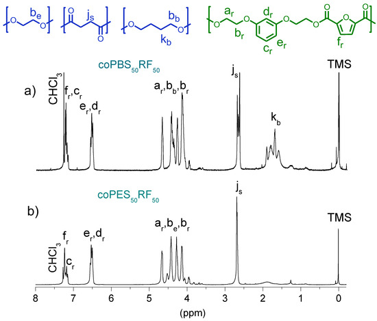 1H NMR spectra of resorcinol-containing succinate-furanoatecopolyesters. (a) coPBS50RF50; (b) coPES50RF50.