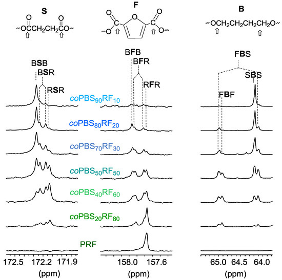 where the dyads fractions were calculated from the integrals of the 13C NMR spectra, and assuming similar relaxation times for the same carbons in the different dyads. It was additionally assumed that in all triads the substitution on the left of a central unit does not influence the substitution on the right. The 13C NMR spectra of the coPBSxRFy series are shown in Figure 7 where it is seen that some of the signals split into four peaks due to the sensitivity of these carbons to sequence distribution at the level of triads. By deconvolution of these signals the content of the different dyads could be easily obtained and then nBS and nRF, and the degree of randomness B calculated by applying the equations described above. A similar approach was used for the analysis of the coPESxRFy series whose 13C NMR spectra are shown in Figure S3 of the SI file. B an n values for the two series are given in Table 2 revealing that the microstructure of the two series of copolyesters is essentially at random.