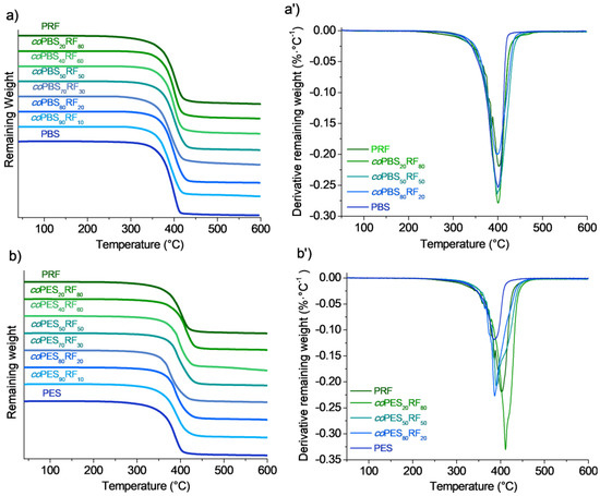 TGA traces of coPBSxRFy and coPESxRFy series (a,b) and their derivative curves (a’,b’).