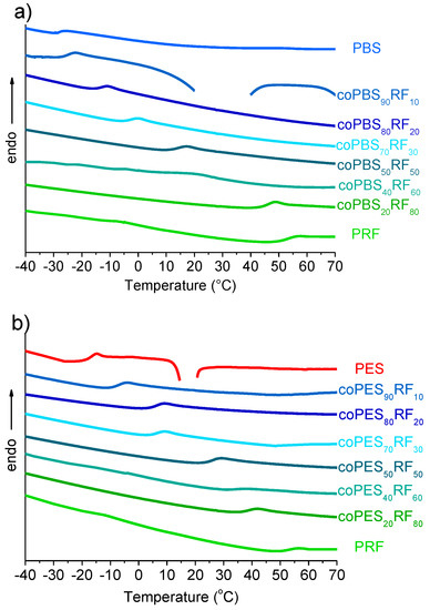 The evaluation of the glass-transition temperature in these copolyesters has deserved particular attention since tuning this parameter by adjusting the content in RF units constitutes one of the main aims of this work. Tg was measured by DSC from samples that were previously heated at 200 °C to erase their previous history. The thermograms of all the members of the two copolyesters series are comparatively depicted in Figure 9 where Tg is denoted as a clear positive inflection of the trace recorded at heating, and their numerical values are given in Table 3.